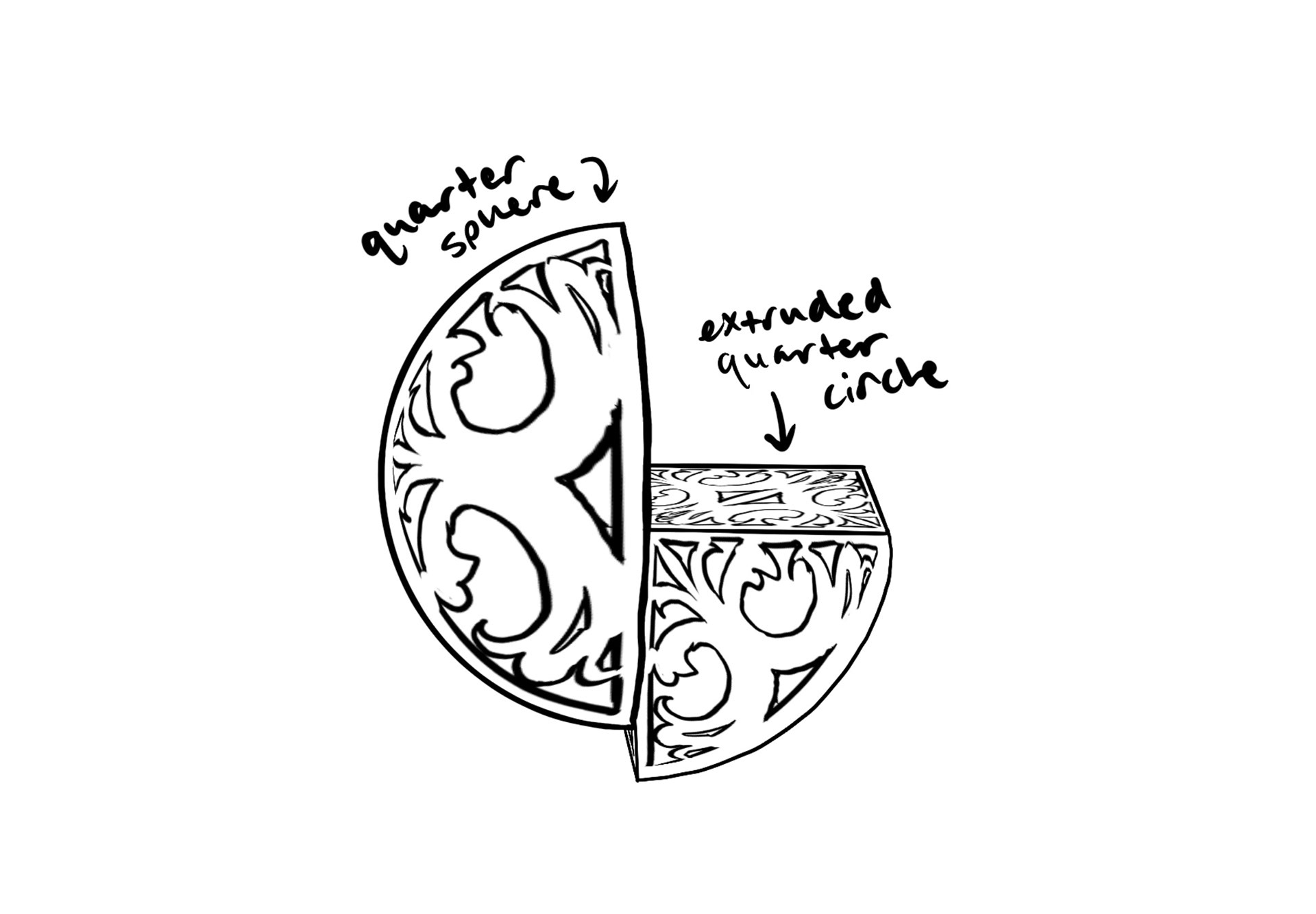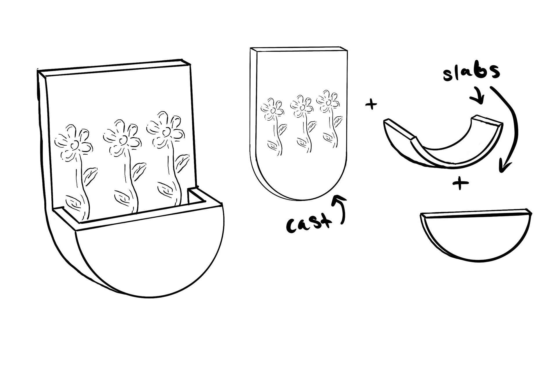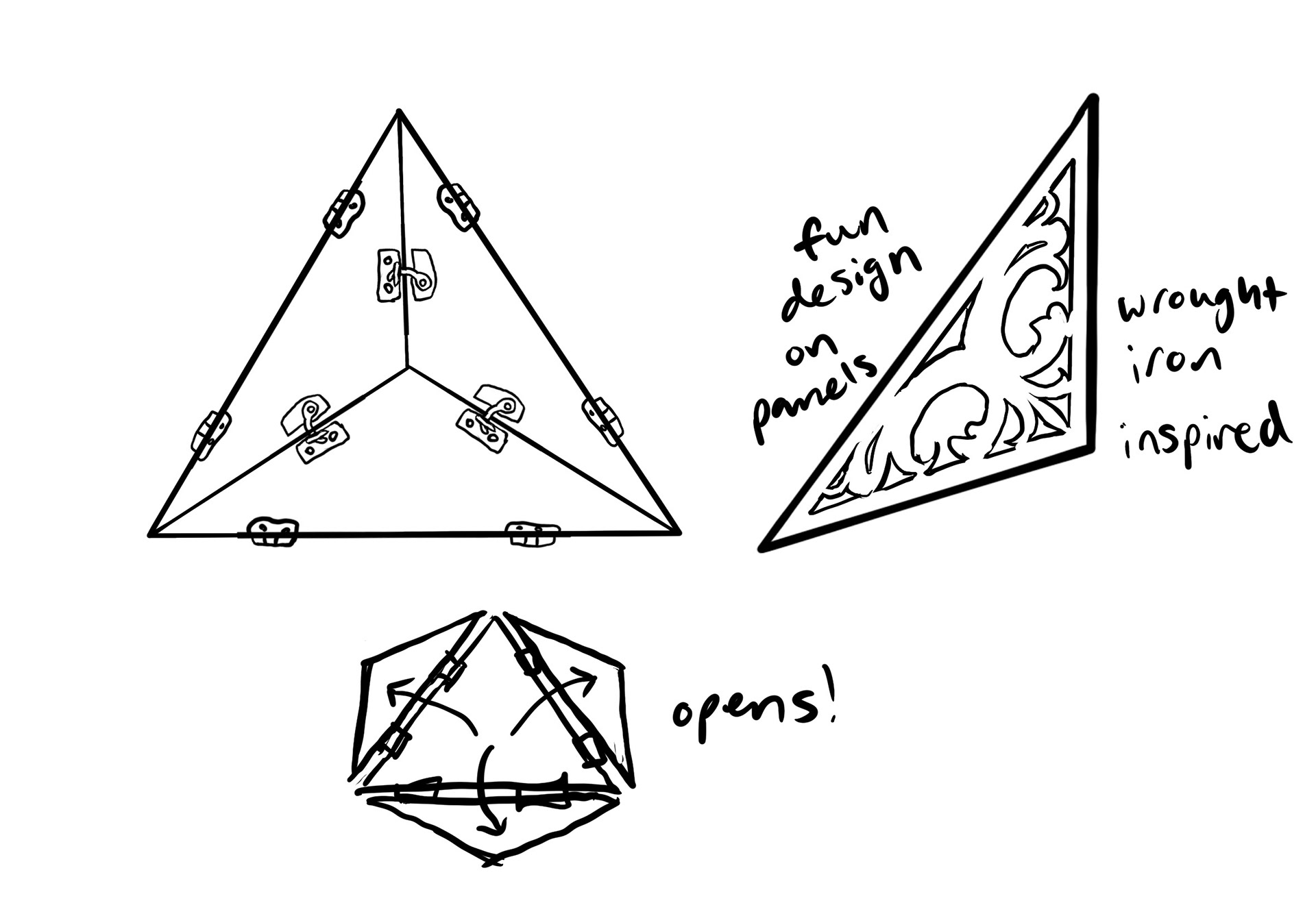 We proposed concepts for three different letters: "U," "A," and "G." The "U" concept was for the scoop of the letter to jut out and become a planter and to make it out of clay. The second proposal was to create a hinged pyramid structure that opens for the letter "A," and it would be laser cut on the metal cutter in Sherman Hall. The concept for the "G" had a similar wrought iron inspiration, and the original goal was to cast iron to create this form.