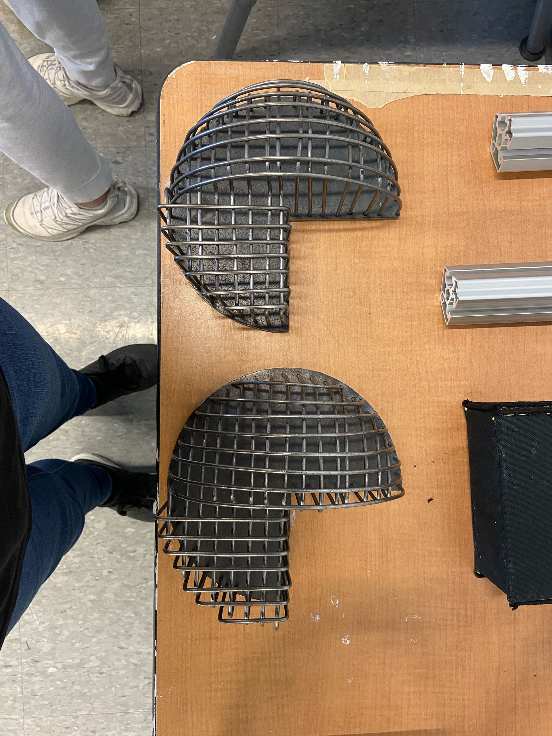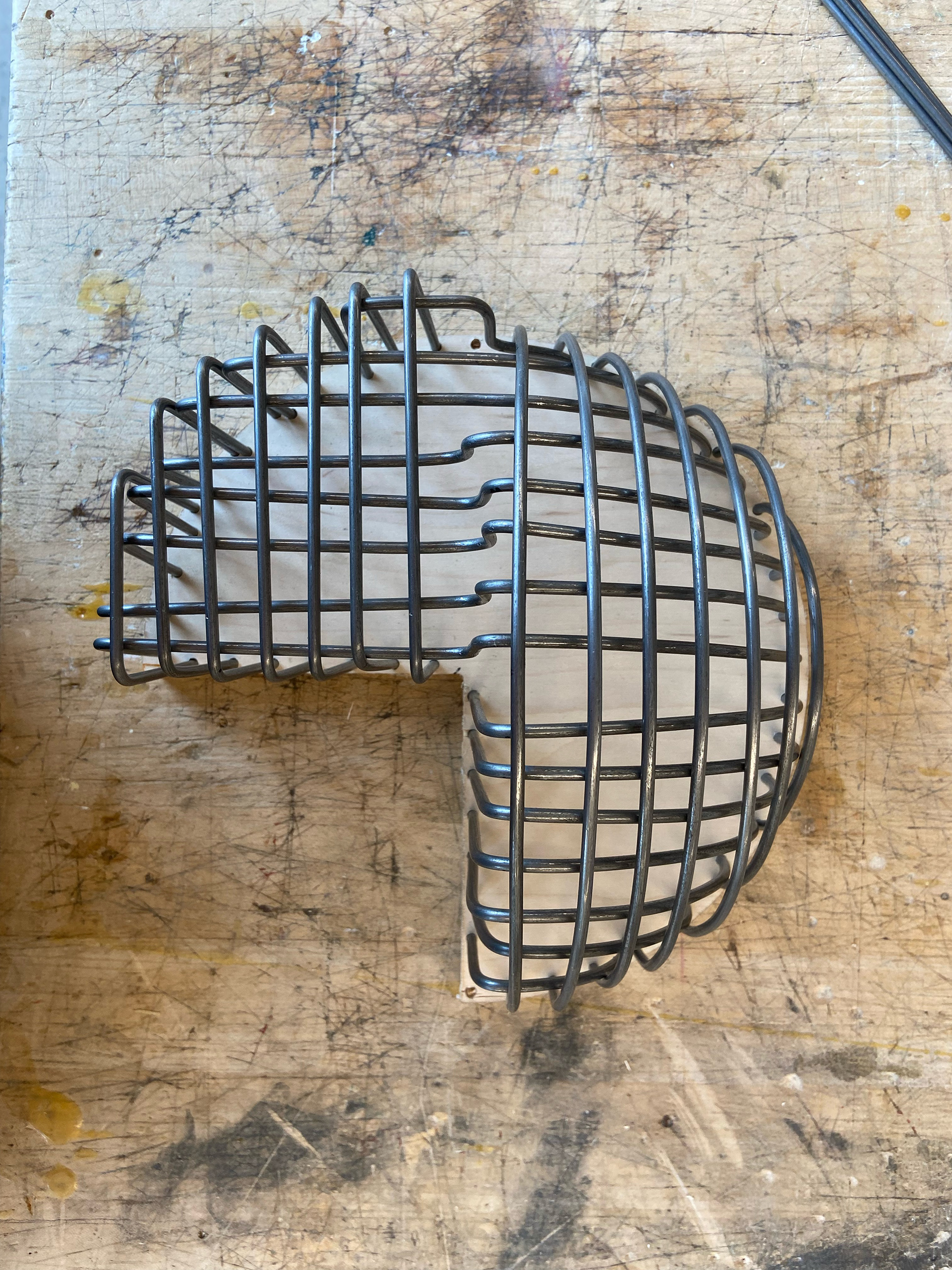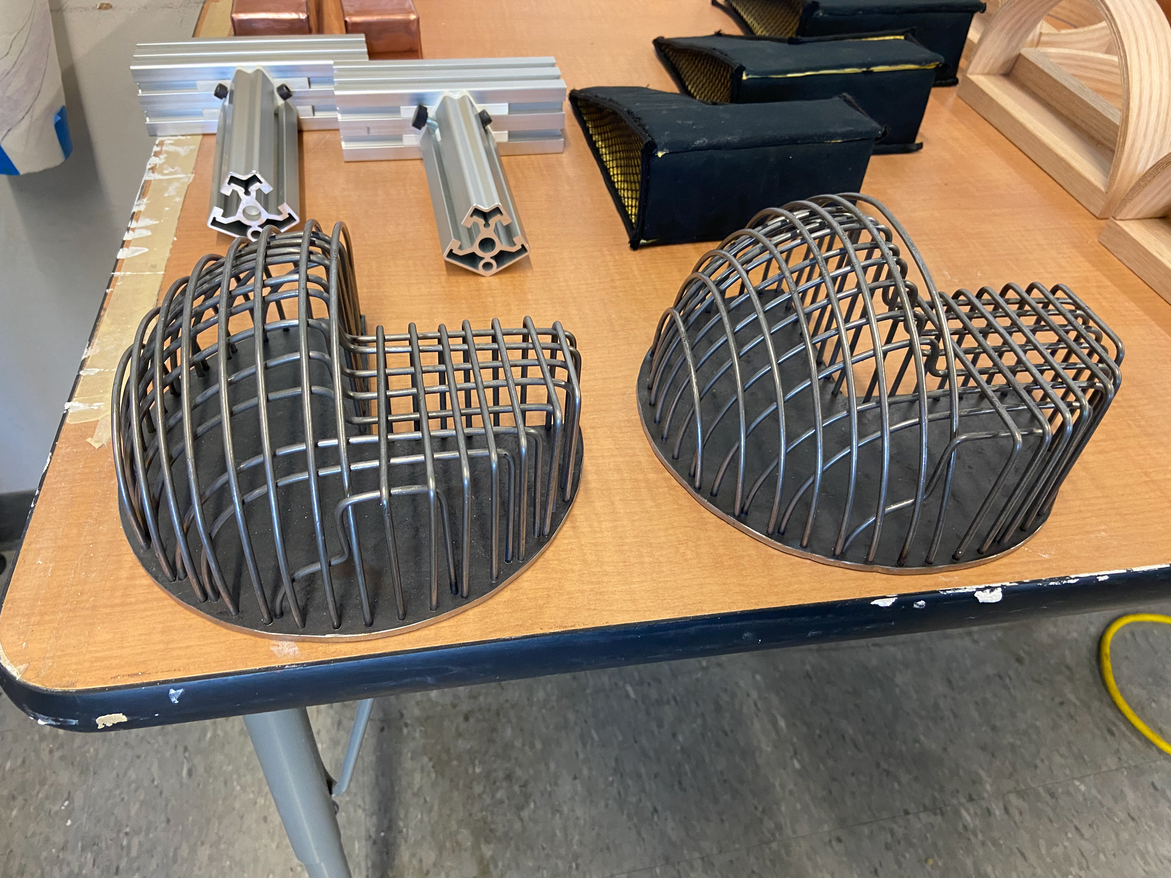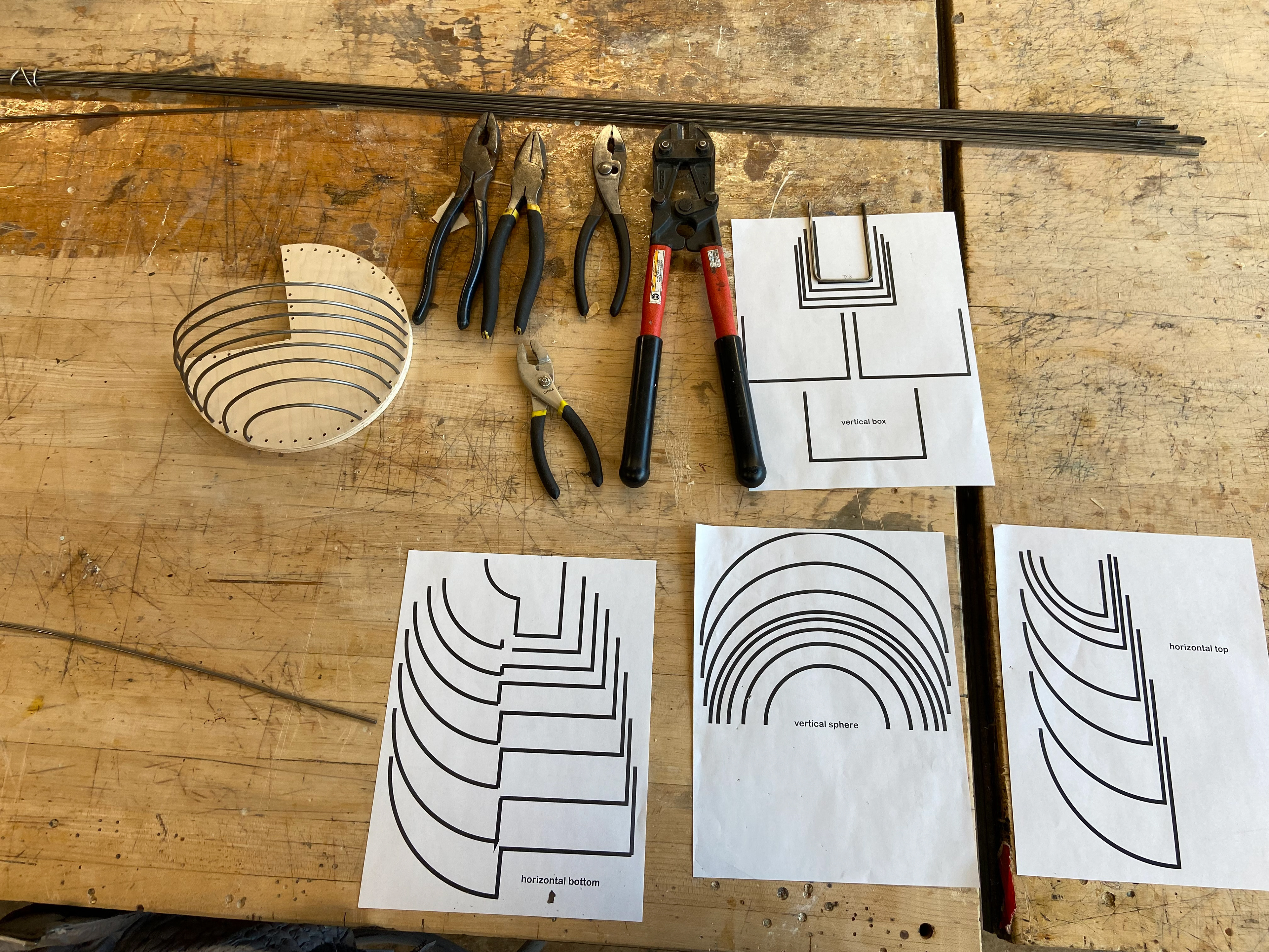 We mapped out the line shapes we needed and printed them onto paper so that we could hold the wire up to them for reference. By bending the wire between two screws in a piece of wood, we were able to create the complex shapes needed. The back plates were cut on the bandsaw and refined with an angle grinder. Then we stuck the wires into place and welded the grid together!