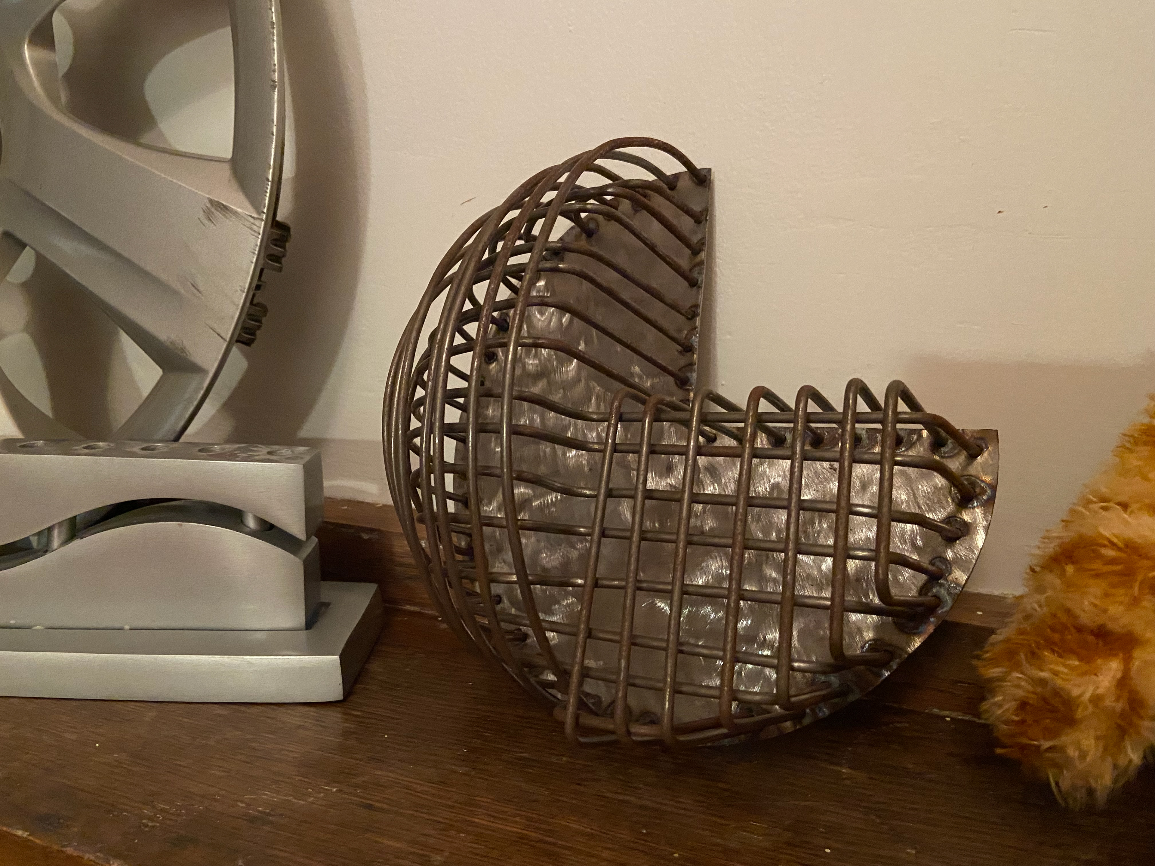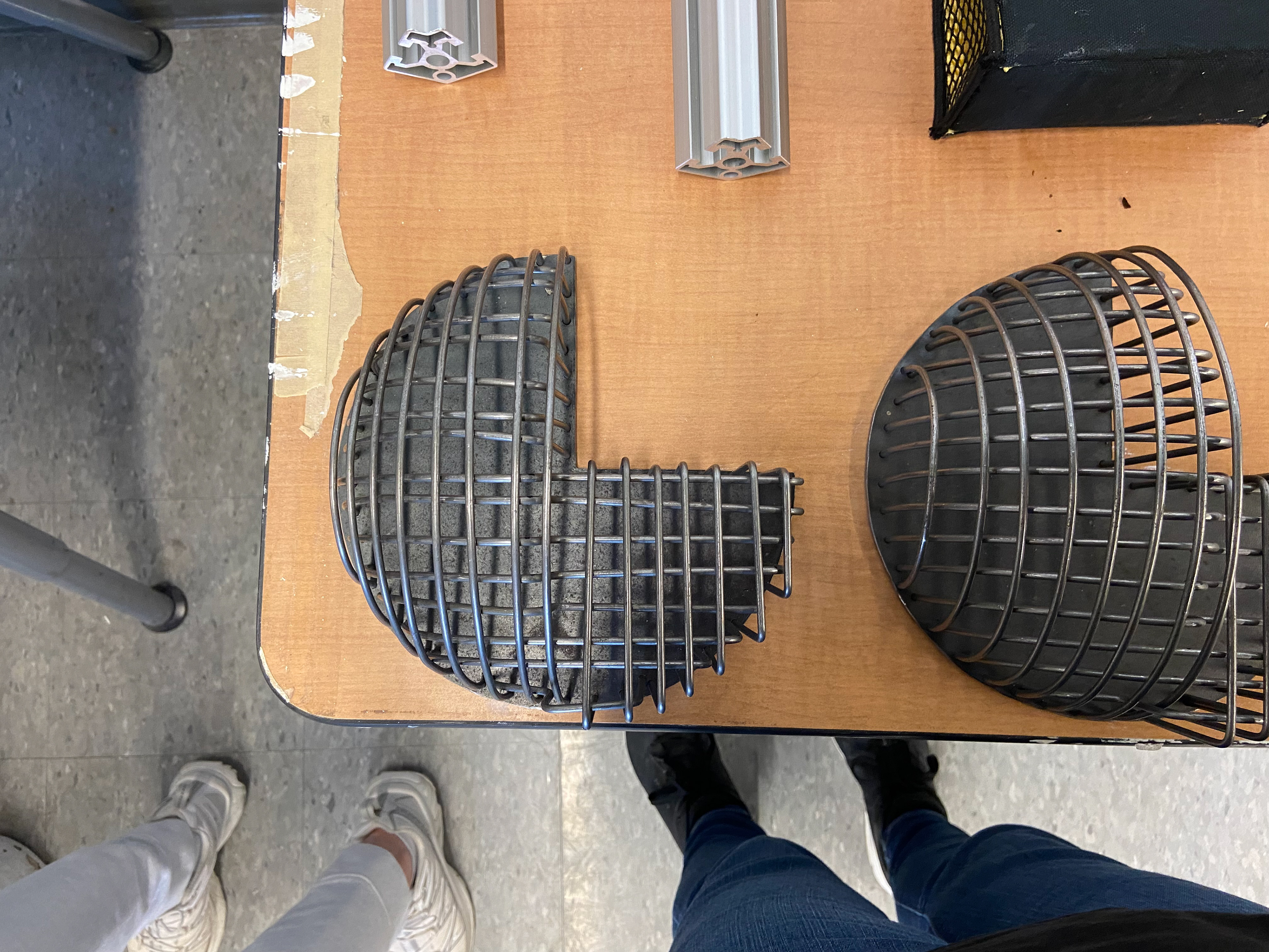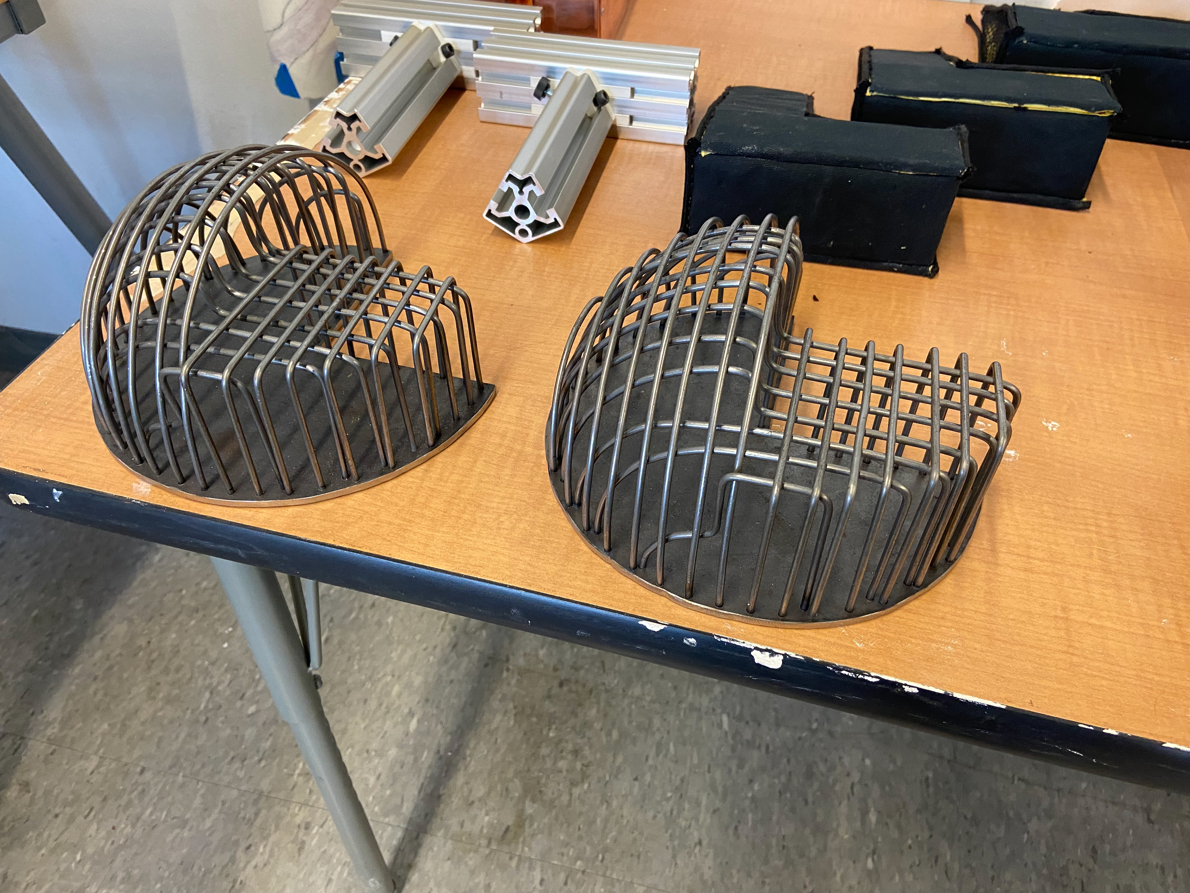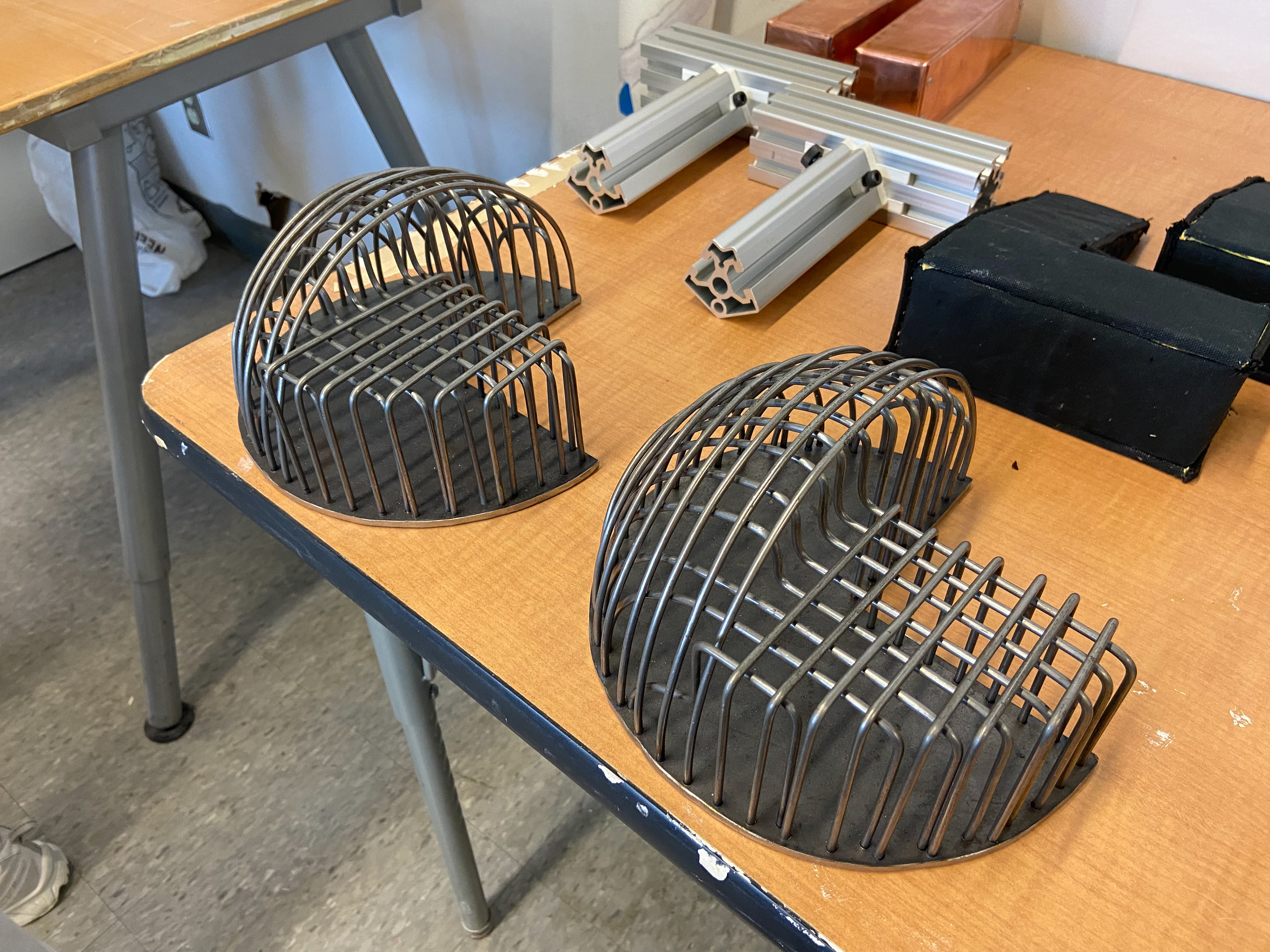 We mapped out the line shapes we needed and printed them onto paper so that we could hold the wire up to them for reference. By bending the wire between two screws in a piece of wood, we were able to create the complex shapes needed. The back plates were cut on the bandsaw and refined with an angle grinder. Then we stuck the wires into place and welded the grid together!